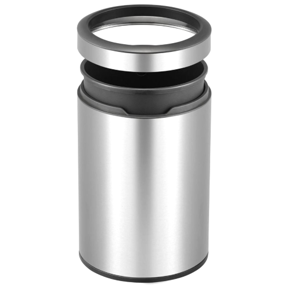 Στρογγυλός κάδος απορριμμάτων από βουρτσισμένο ανοξείδωτο ατσάλι με ανοιχτό άνοιγμα στο πάνω μέρος. Εξοπλισμένο με πλαστικό εσωτερικό κουβά και επίστρωση με δακτυλικά αποτυπώματα. Αφαιρώντας το χαλαρό επάνω μέρος, ο σάκος απορριμμάτων είναι εύκολο να αλλάξει και ο σάκος απορριμμάτων παραμένει τακτοποιημένος. Τα καουτσούκ καλύμματα στο κάτω μέρος προστατεύουν και διατηρούν τον κάδο απορριμμάτων στη θέση του. Διάμετρος: 240mm Ύψος 380mm