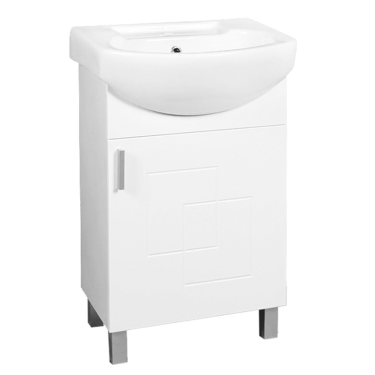Λευκό ντουλάπι μπάνιου PVC με νιπτήρα από λευκή πορσελάνη με υπερχείλιση και οπή βρύσης. Ανθεκτικό στο νερό και την υγρασία, με μεντεσέδες με μηχανισμό Soft Close.