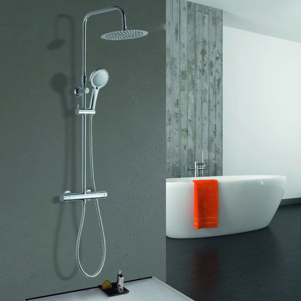Χρωμιωμένη θερμοστατική στήλη ντους Lomi της Inventiv με εξαιρετικά επίπεδη κεφαλή ντους από ανοξείδωτο ατσάλι και χρωμιωμένο τηλέφωνο ντους με 3 ακροφύσια και ακροφύσια κατά των αλάτων.