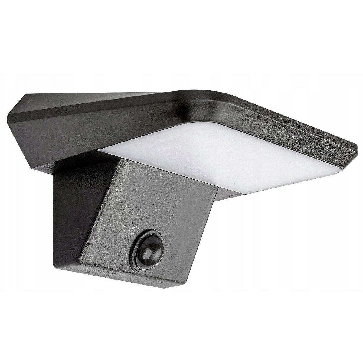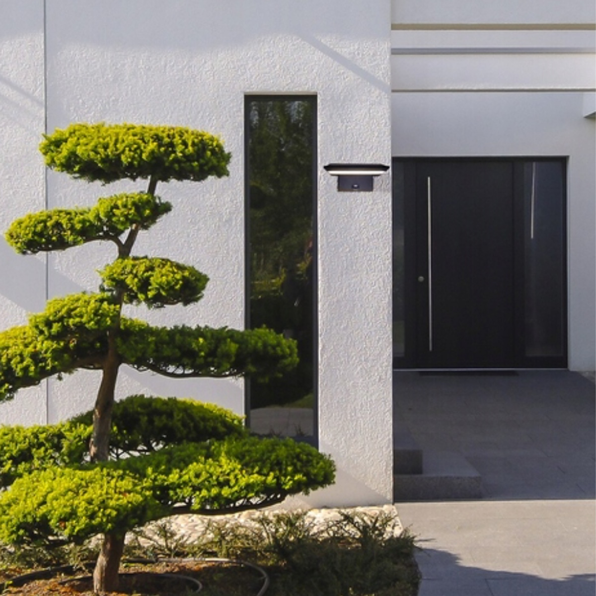 Ένα σύγχρονο ηλιακό φωτιστικό Qesa με αισθητήρα κίνησης, για εξωτερική χρήση, κυρίως σε βεράντα ή στον εξωτερικό τοίχο ενός σπιτιού για να φωτίζει το μονοπάτι που οδηγεί στην είσοδο.