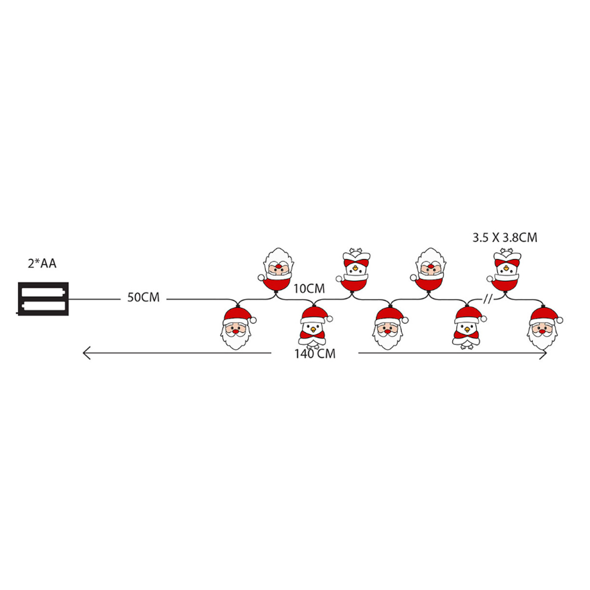 Lamp type: LEDProduct material: AcrylicTotal Number of Lamps/Lights: 10Wire colour: TransparentLamp colour: Warm whiteColor Temperature (Kelvin): 2400-2700Lamp size: 5mmLength (cm): 90+50Decorative Item Dimensions (Length x Height x Width cm): 3.5×3.8×0.6Lamp distance (cm): 10Lead wire (cm): 50Power supply: Battery