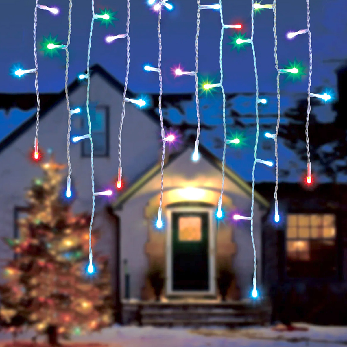 96 LED Christmas lights with warm white lighting from the company Eurolamp. They have a waterproof rating of IP44 which makes them suitable for outdoor areas. The cable is made of PVC in green color. It has a timer and has 8 lighting programs. It operates with 3 AA batteries (not included). The bulbs are 0.3cm in size each and are 10cm apart. The total length is 10.5 meters, of which 1 meter is an extension cable. It has built-in LED boards with a total power of 0.96Watt, warm white light (2400K).