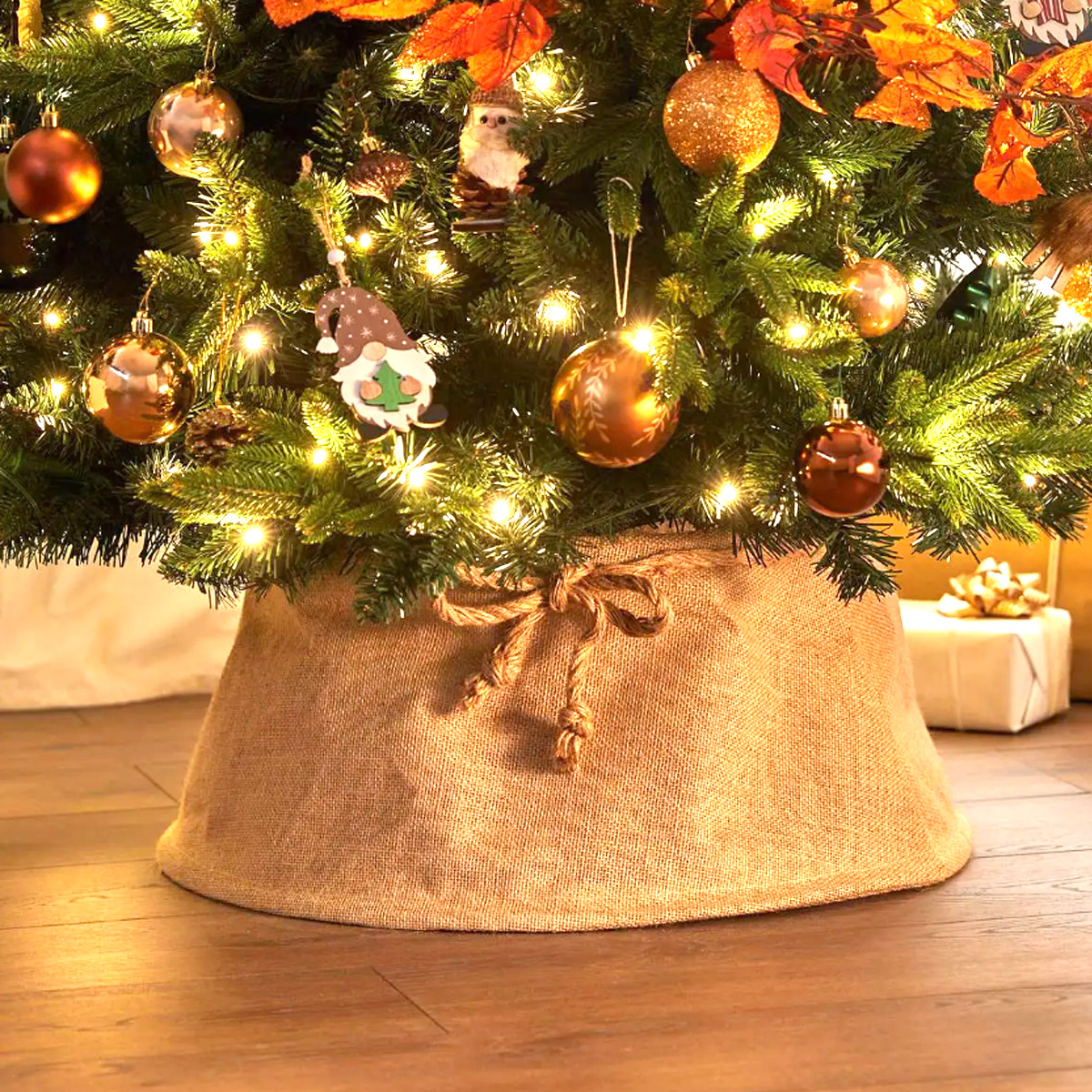 Beige jute mat tree apron. It has a diameter of 56cm and is placed under the Christmas tree to hide unwanted cables and its base.