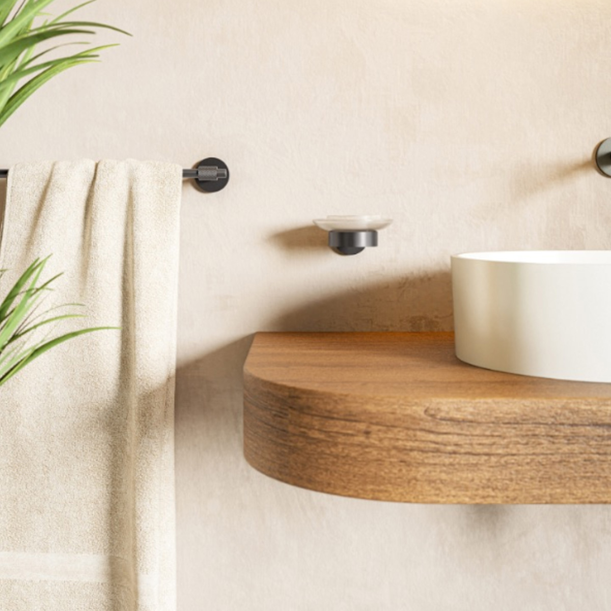 Soap dish mounted with screws or glue.Dimensions: 110 x 57 x 130 mm.Material: Stainless steel/glass/gray.