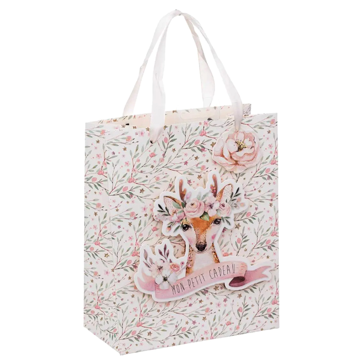 Large paper gift bag in red-green shades with a Christmas design. It has red satin ribbon handles and a greeting card.