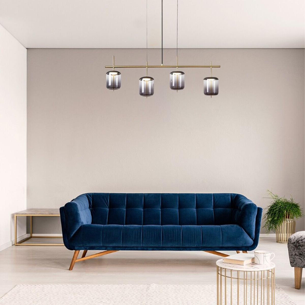 The Delice quadruple pendant lamp, available from the lampanox.pl online lighting store, is made of a combination of metal and glass, making it a unique addition to your modern home. Whether you place it in the living room or dining room, your guests will definitely notice it. The black and brass metal lamp is complemented by tinted lampshades and a square, black decorative base. The light is softly filtered under the dark Delice lampshades, which exude a unique atmosphere. This quadruple chandelier has built-in LED light sources with a total power of 24 W, a brightness of 1920 lumens and a color temperature of 4000 K. The light sources emitting natural white light have energy class A. The dimensions of this Delice chandelier are 950 mm in diameter and 1500 mm from the ceiling.