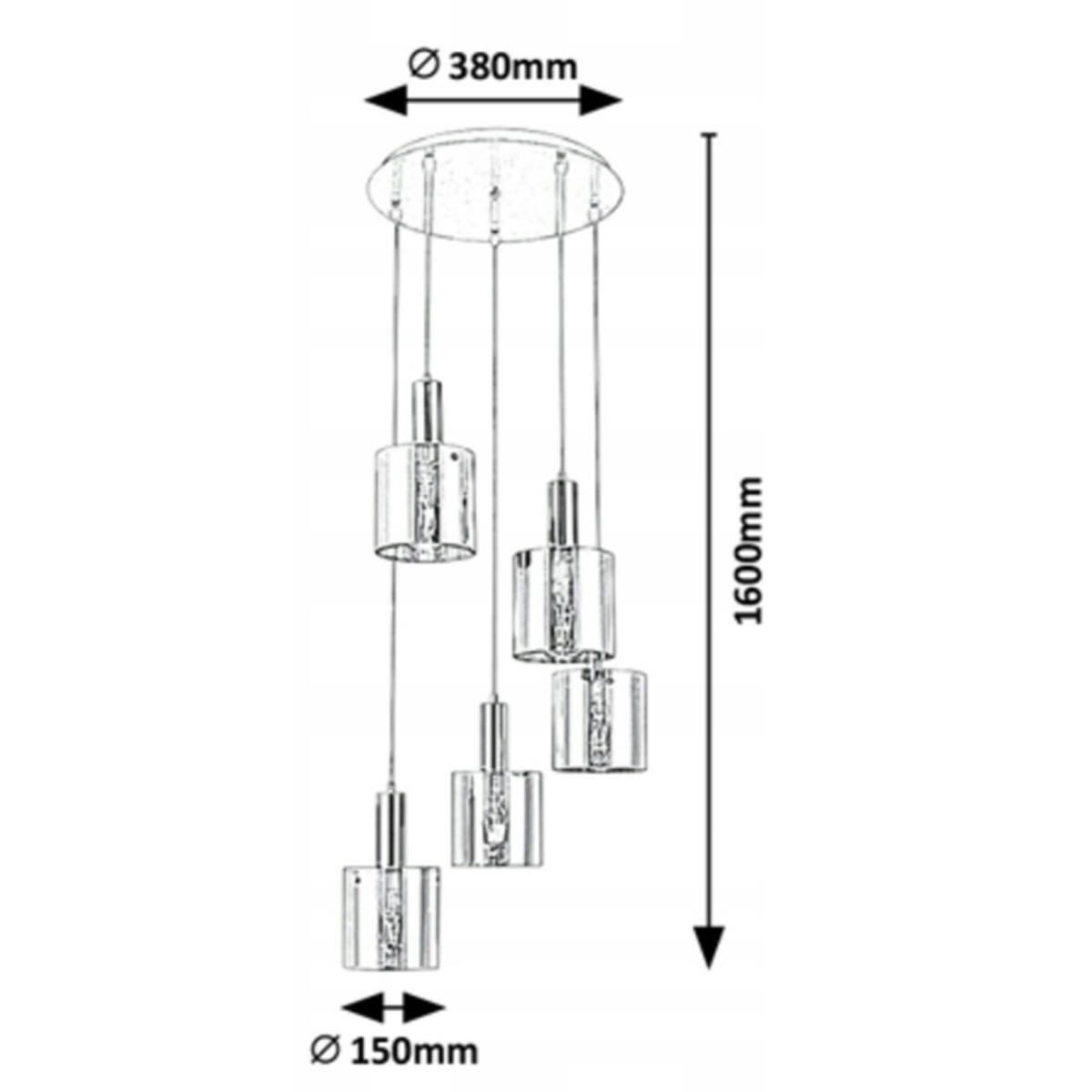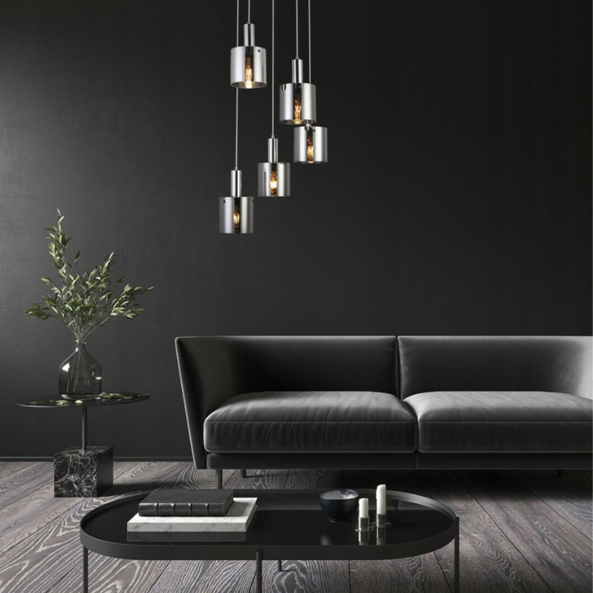 Rabalux Donati – an elegant pendant lamp with five light sourcesThe elegant pendant lamp Rabalux Donati 5251 is synonymous with modern design and excellent functionality. Five separate pendant lamp heads in a luxurious chrome finish with tinted glass shades add a unique lighting effect and a sophisticated visual element to your interior. It is ideal for lighting a dining room, living room, kitchen or bedroom.Unique, modern designThe chrome-plated metal elements in combination with the cylindrical shades create a sense of lightness and luxury. The various suspension lengths allow for dynamic placement of the light, enhancing the modern character of your space. At the same time, the tinted glass softens the light and creates a warm atmosphere, while the lamp remains barely visible.