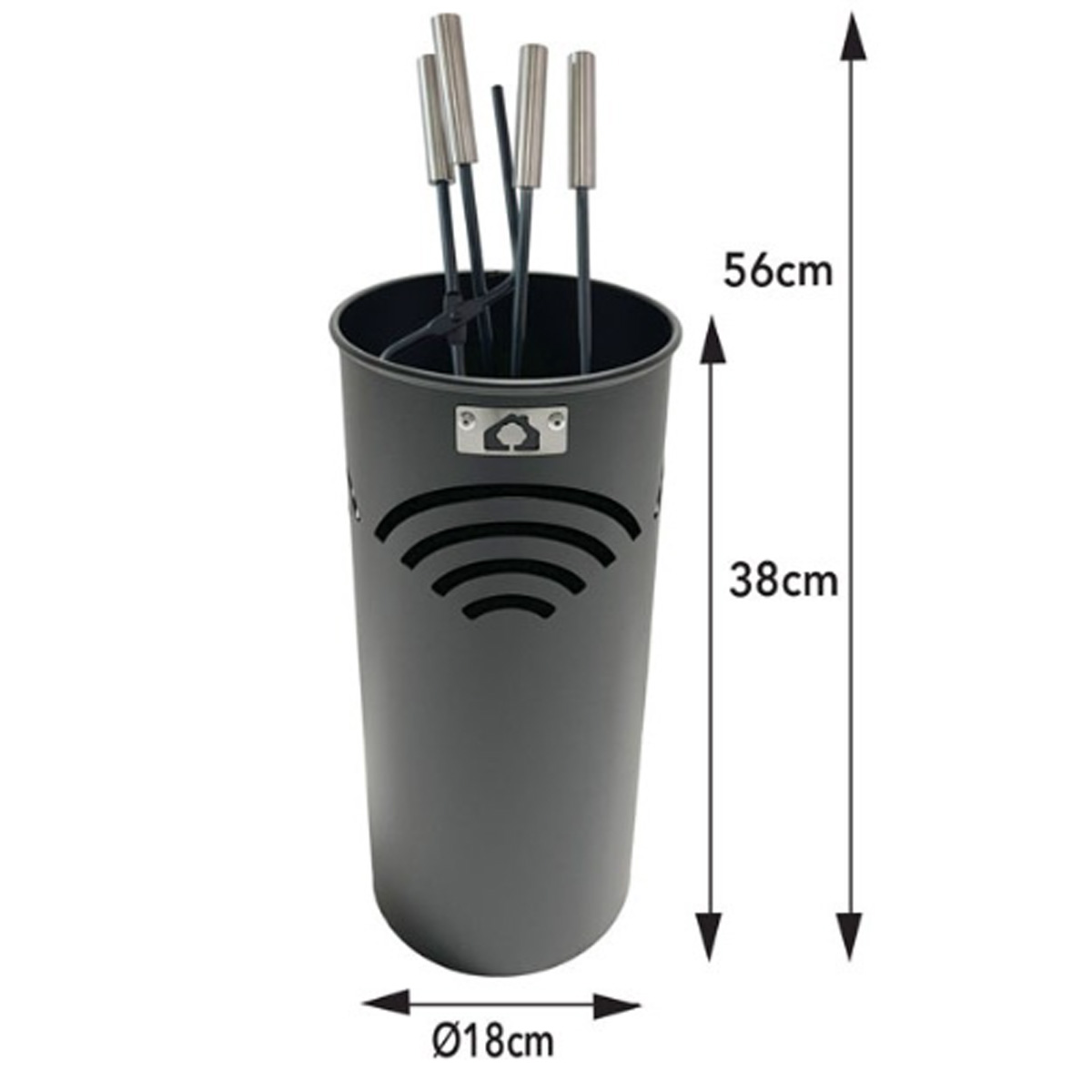 Metal set of 4 WIFI tools with round bucket in black colorIncludes: 4 tools brush, shovel, chisel, tongs with stainless steel handlesDurable construction for high temperaturesA functional tool set for every fireplace