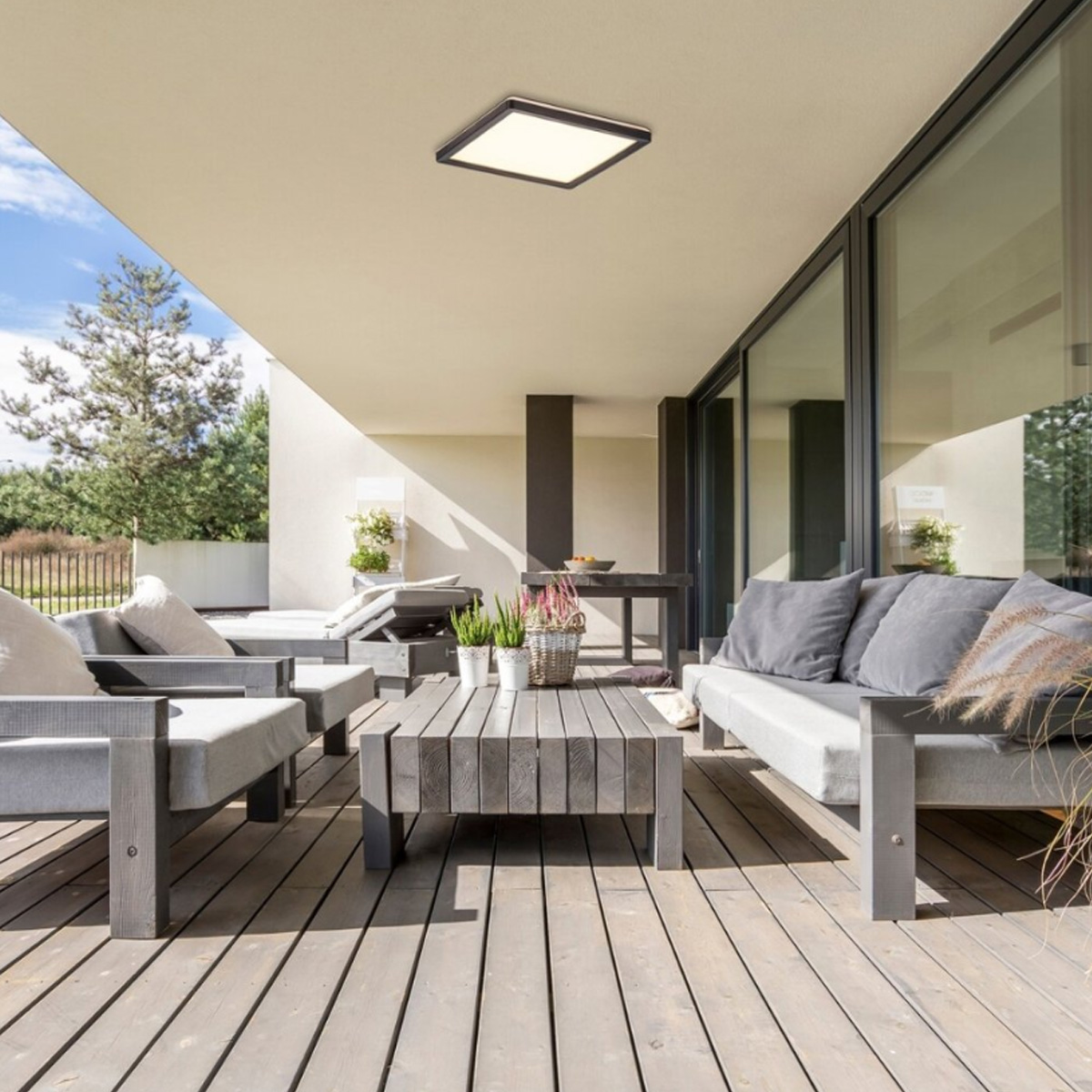 We recommend the modern-style, square Inverness outdoor ceiling light primarily for the terrace. This black model featuring a white lampshade offers a whole bunch of convenience functions. The all-plastic lamp contains a built-in LED lightsource with a power of 15W, a luminous flux of 1190 lumens and an outstanding life-span of 30,000 hours! The Inverness is dimmable, i.e. its brightness can be changed as desired using a remote control. The same applies to colour temperature which can be set between 2700 – 6500K. But there’s more: the lamp boasts a memory, a timer and a nightlight function, furthermore it features backlight. It can also be controlled via Wi-Fi connection. The dimensions of this light is 250x250mm, its distance from the ceiling is 30mm. Thanks to its IP44 protection it is protected against the intrusion of objects up to 1 mm in diameter and against water splashing from any direction.