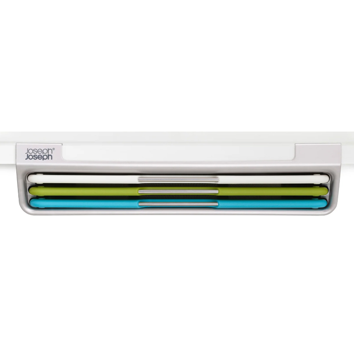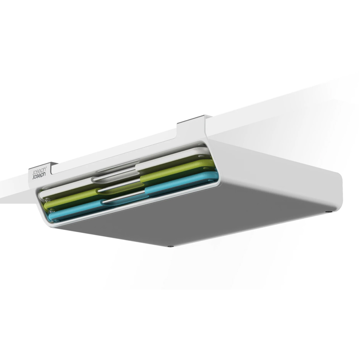 Cutting boards are an everyday kitchen essential, but for those who prefer to keep their countertops clutter-free, the Folio™ Slim introduces a new way to store. This innovative set, featuring three color-coded, knife-friendly cutting boards, features a slim storage case that – wait for it – hooks onto the shelf to save space, keeping your cutting boards off the countertop and within reach.Unique design makes use of unused space under the shelfIncludes three double-sided boards with easy-to-use, textured cutting surfaces and non-slip feetSlab design and stainless steel bars on the boards for easy selectionEasy to install (screws included)Suitable for kitchen cabinets over 33 cm (13”) W x 24 cm (9.5”) D Board size: 20 x 30 cm (7⅞ x 11⅞ inches)Care & use:Boards – dishwasher safe.Case – wipe with a damp cloth.Caution: Failure to follow installation instructions may cause damage to the cabinet shelf.Do not use abrasive cloths or harsh chemical cleaners.The knife-friendly surface of the boards is designed to leave slight marks with use.