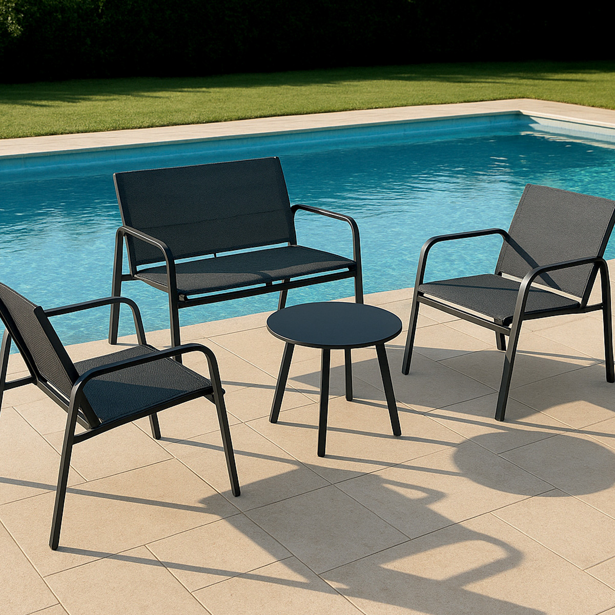 Low 4-seater lounge set in black, ideal for your garden.