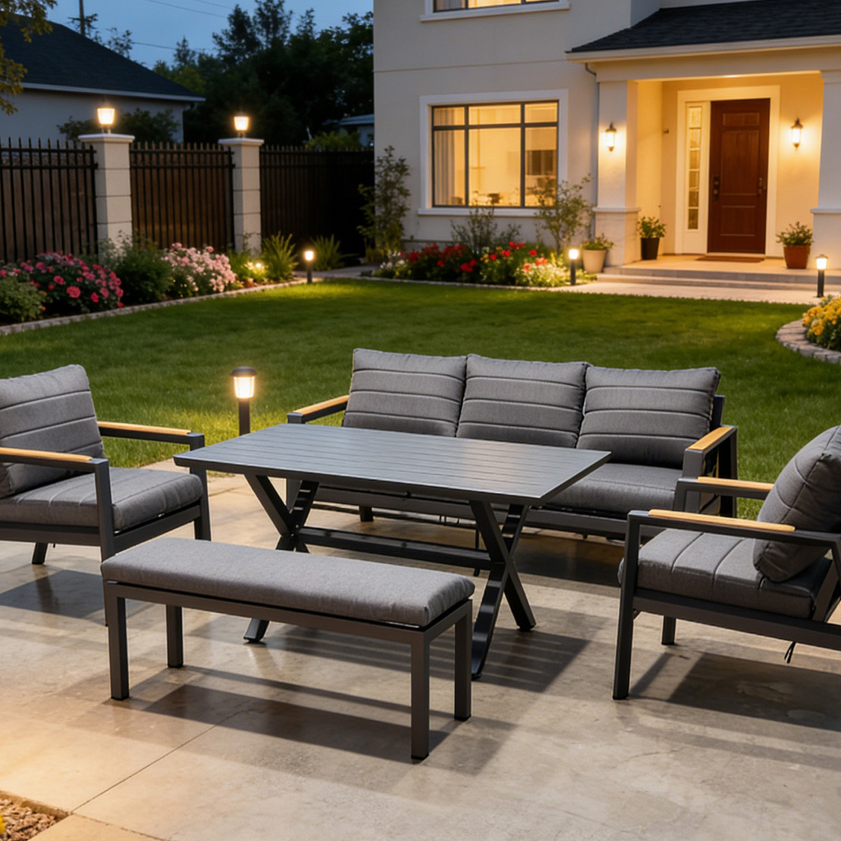 The Garden Lounge is ideal for your garden with the advantages of durability, comfort, quality of materials and suitability for indoor spaces.Three-seat sofa (pieces: 1) 201 × 89 × 72,5 cmSingle sofa (pieces: 2) 77 × 89 × 72,5 cmTable (pieces: 1) 150 × 86 × 66 cmBench (pieces: 1) 120 × 40 × 36 cm