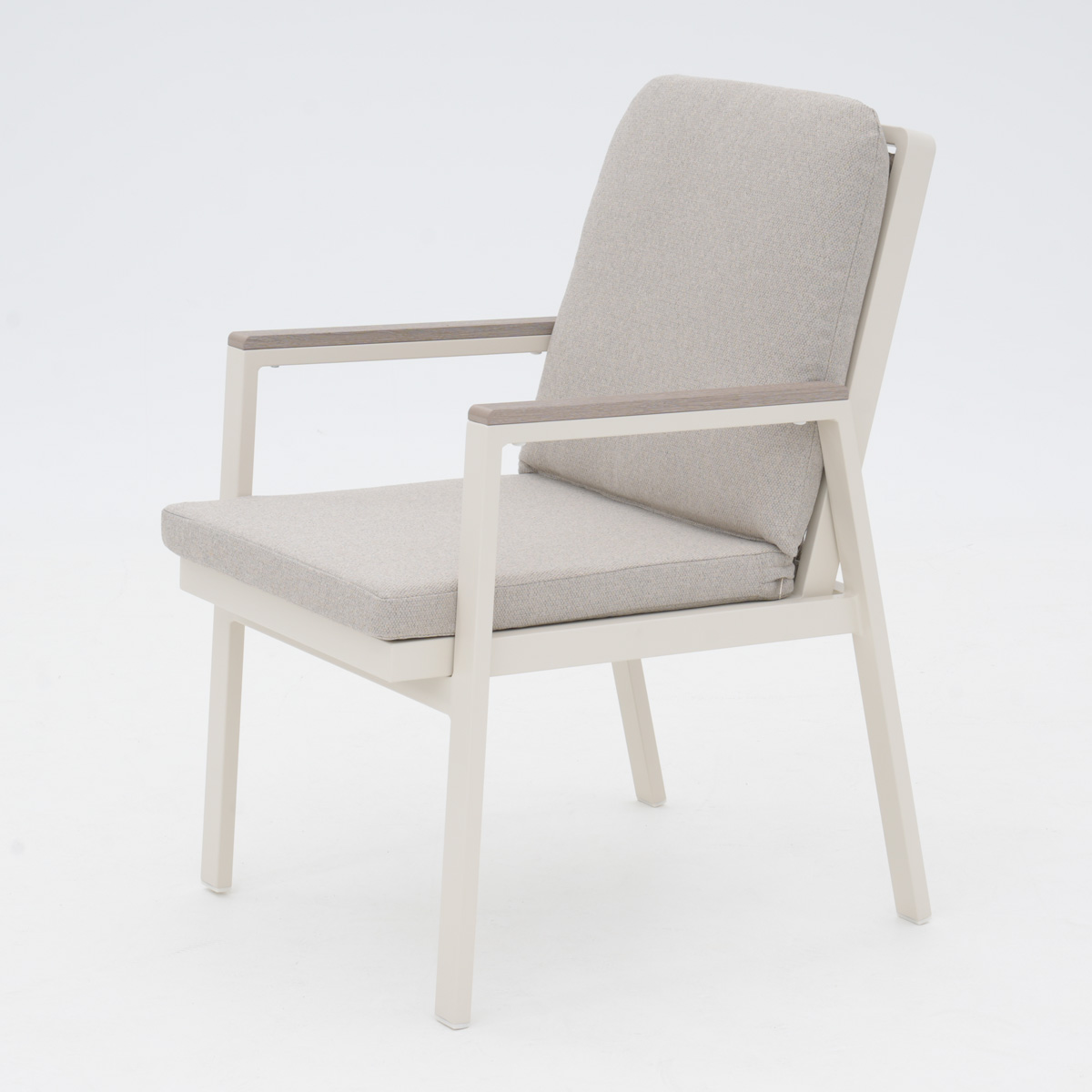 GC23110Q1A -9 9 piece dining set (8 Chairs & 1 table) Material Allumunium Frame powder coating Wicker 18 x 9 foaming rope cushion, 5 cm seat cushion, 25D sponge, with PP cotton Pillow polly wood on arm and table top packing: 1pc chair in a ctn, 1 table in a ctn