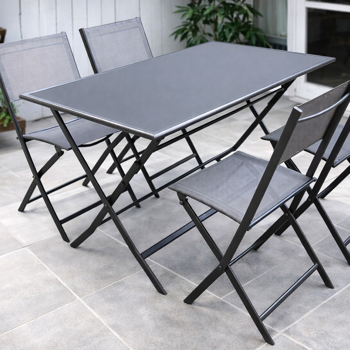 5 pcs Outdoor Dining Set1 x Steel Glass TableFinish: Powder CoatedTable Top: 5mm Grey Printed Glass, with Umbrella Hole4 x Textilene Steel Folding ChairFinish: Powder CoatedSeat & Back Fabric: Textilene 1×1