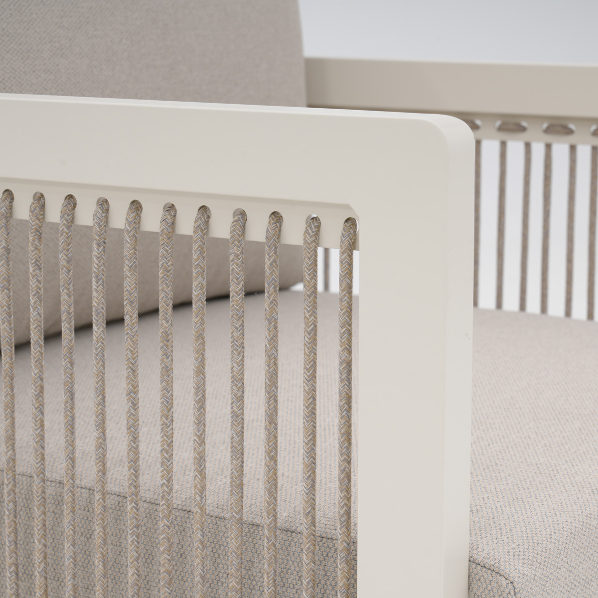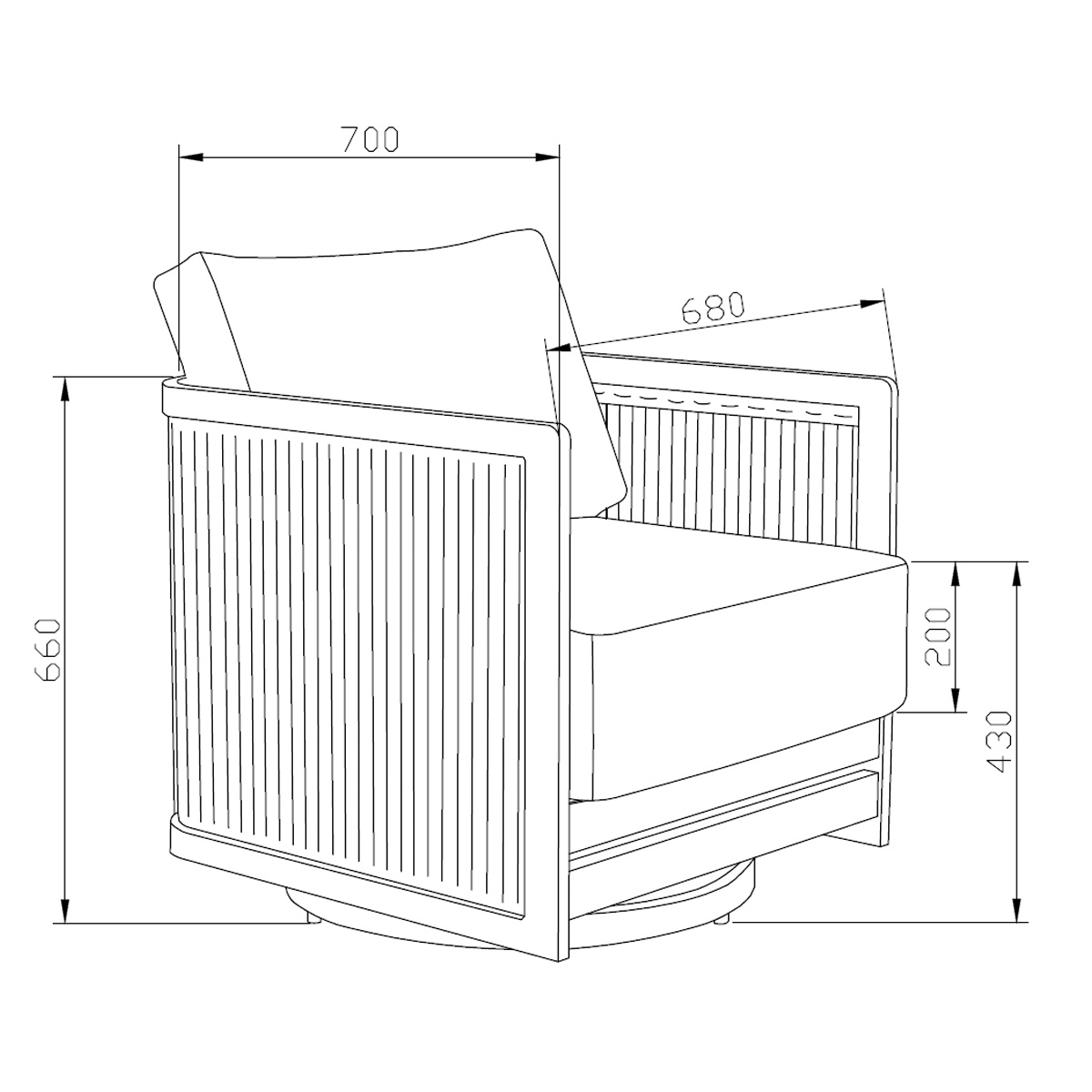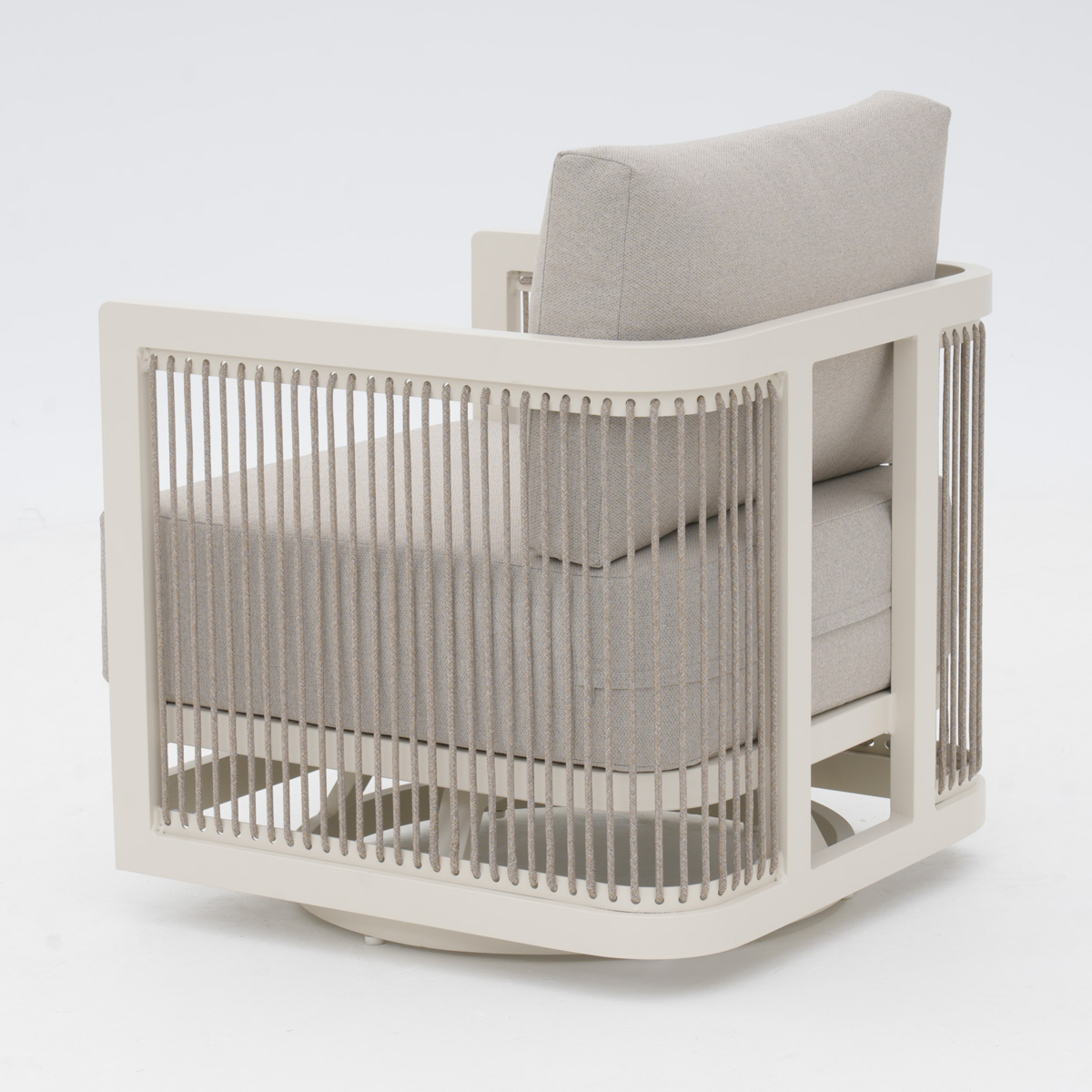 Swival chair set GA25005Q1Z Material:alu frame, powder coating Wicker: dia8mm round polyester rope Cushion: solution dyed fabric, 20cm seat cushion, 25D sponge;PP cotton and non-glue back cushion. table top:polywoodPacking:1set/ctn