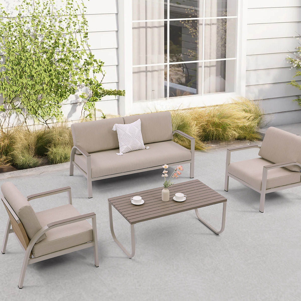 L.H GARDEN SET OF 4 GARDEN LOUNGE ALUMINUM WITH BEIGE CUSHIONS