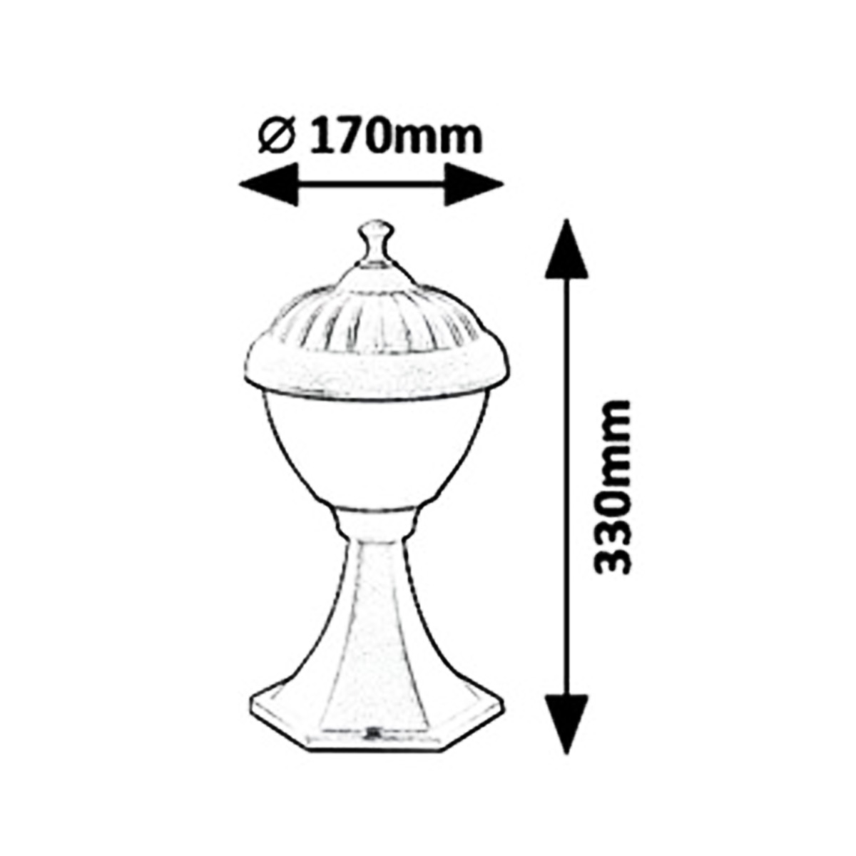 The Modesto outdoor floor lamp is recommended for lovers of traditional style. The lamp, consisting of a characteristic shape, a black metal body and a white plastic shade, creates a special atmosphere in the garden around the house, placed along the path or even on the terrace. Modesto can be used with a single light source with a maximum power of 40 W, the socket type is E27. The lamp is delivered without a light source. The dimensions of the outdoor lamp are as follows: diameter 170 mm, height 330 mm. The IP44 protection of Modesto guarantees that it is protected against the penetration of objects with a maximum diameter of 1 mm and against splashing water from any direction.
