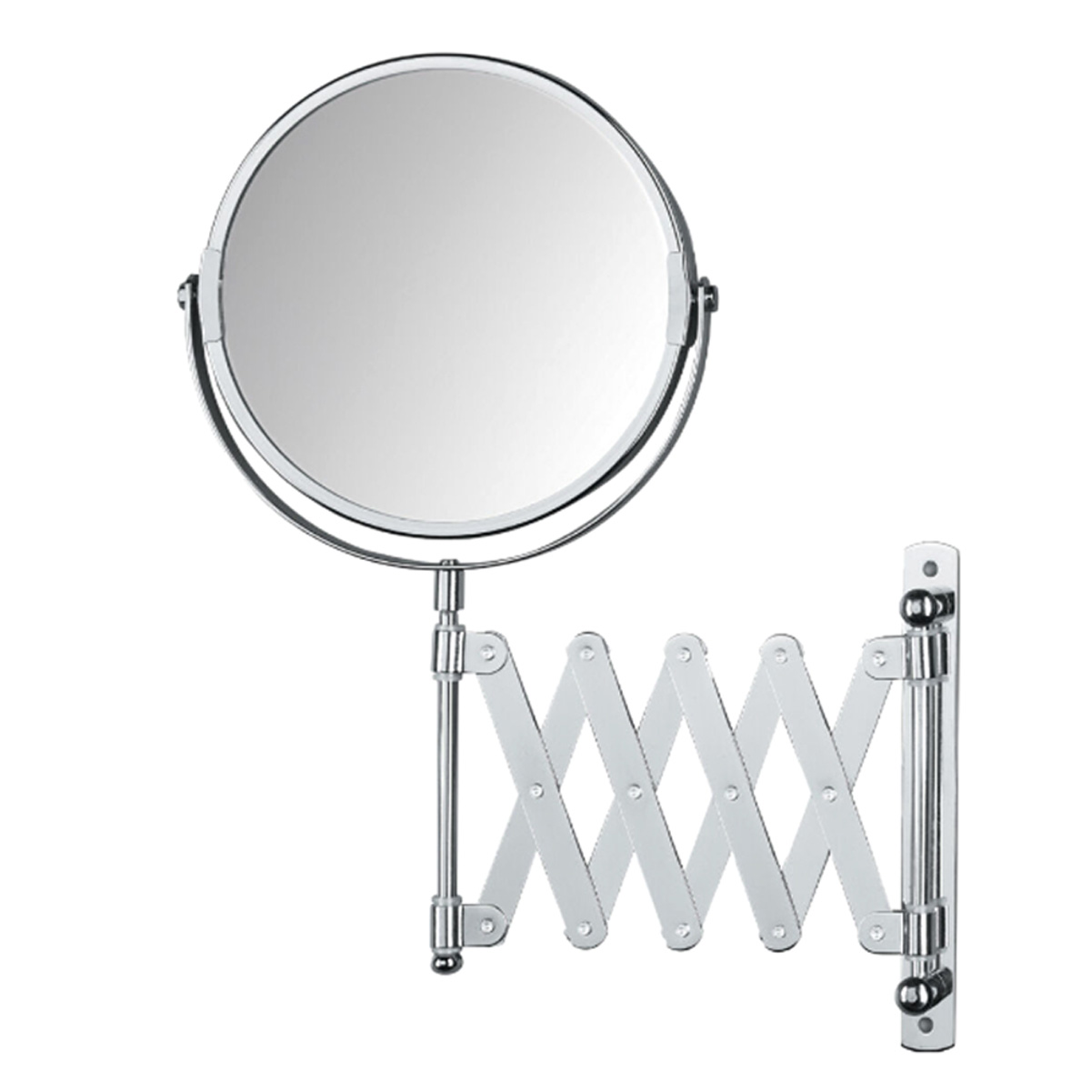 Movable mirror – accordion.Double sided:The other side is a magnifying mirror (3 times).The other side is an ordinary mirror.Mounted on the wall with screws.Stainless steel parts, coated with shiny chrome.