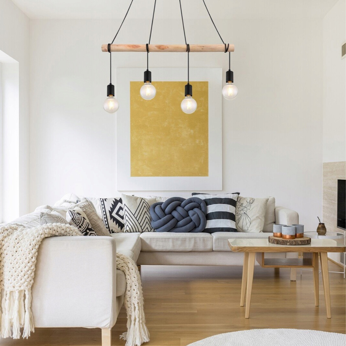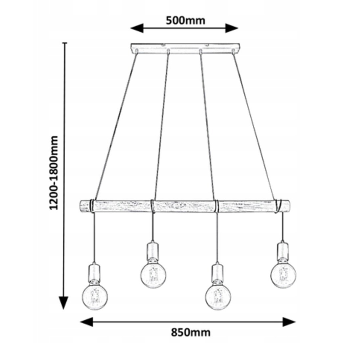 A modern pendant ceiling light. The industrial 4-light Pablo pendant light will make a distinctive addition to a living room, kitchen, dining room or bedroom.This model, made of metal and wood, features a matte black lampshade, a wooden base and independent light sources. The lamp can be mounted on the ceiling using an elongated, square decorative base. The lamp heads hang from the ends of suspension cables wrapped around a thick wooden beam.Their distance from the ceiling is freely adjustable. This spotlight accepts four bulbs, each up to 40W. The socket type is E27. If you want to enhance a warm, homely atmosphere, choose bulbs that emit warm white light for this lamp.The width of the 4-light Pablo ceiling light is 850 mm and its distance from the ceiling can be adjusted from 1200 to 1800 mm. This model is supplied without light sources.