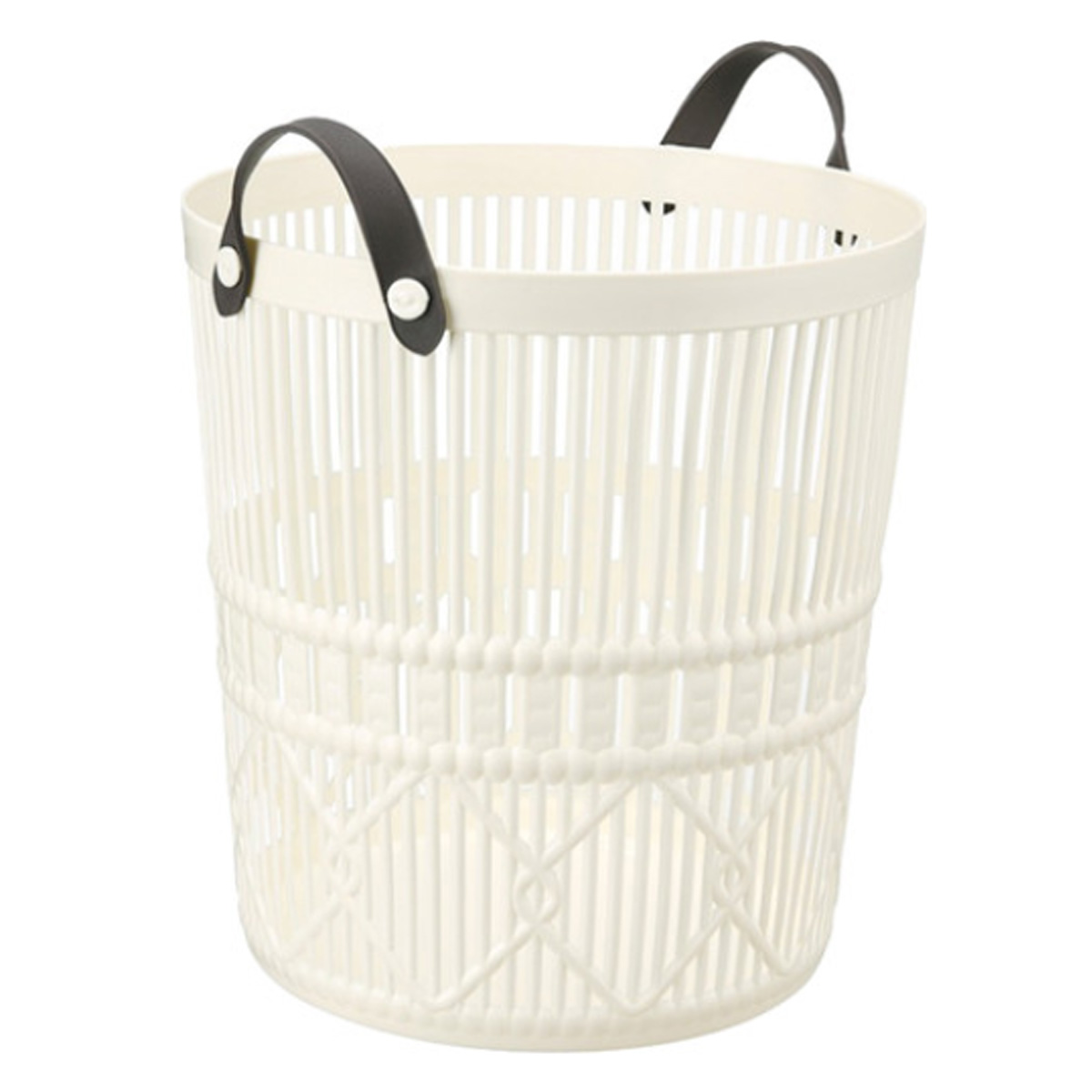 Large capacity laundry basketDurable plastic constructionEasy to carry handleBreathable mesh for ventilationAvailable in 3 colors (beige, white, gray)