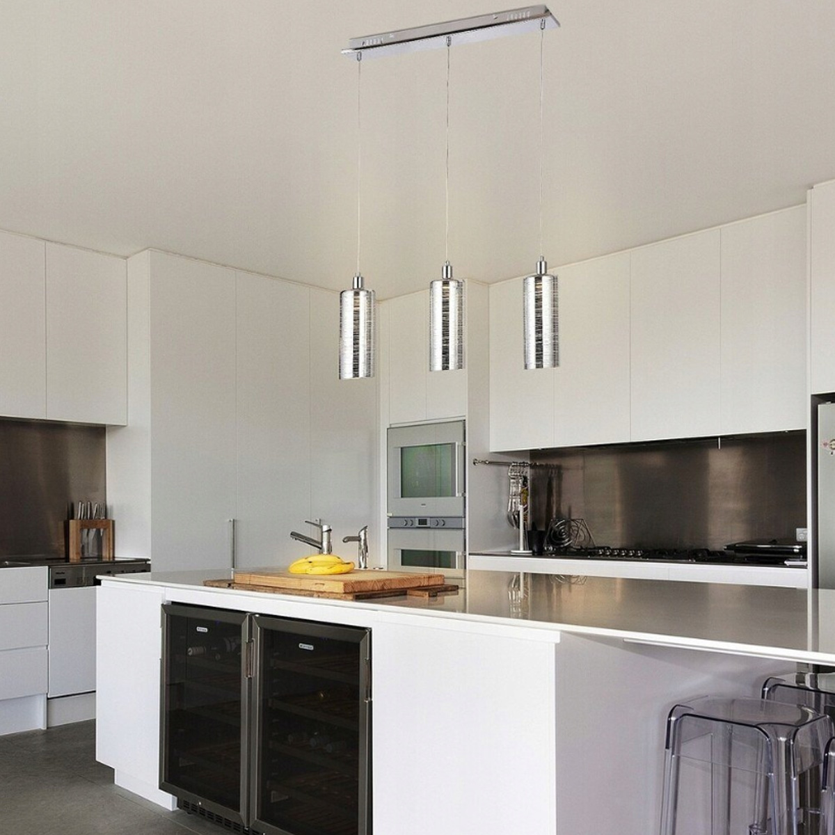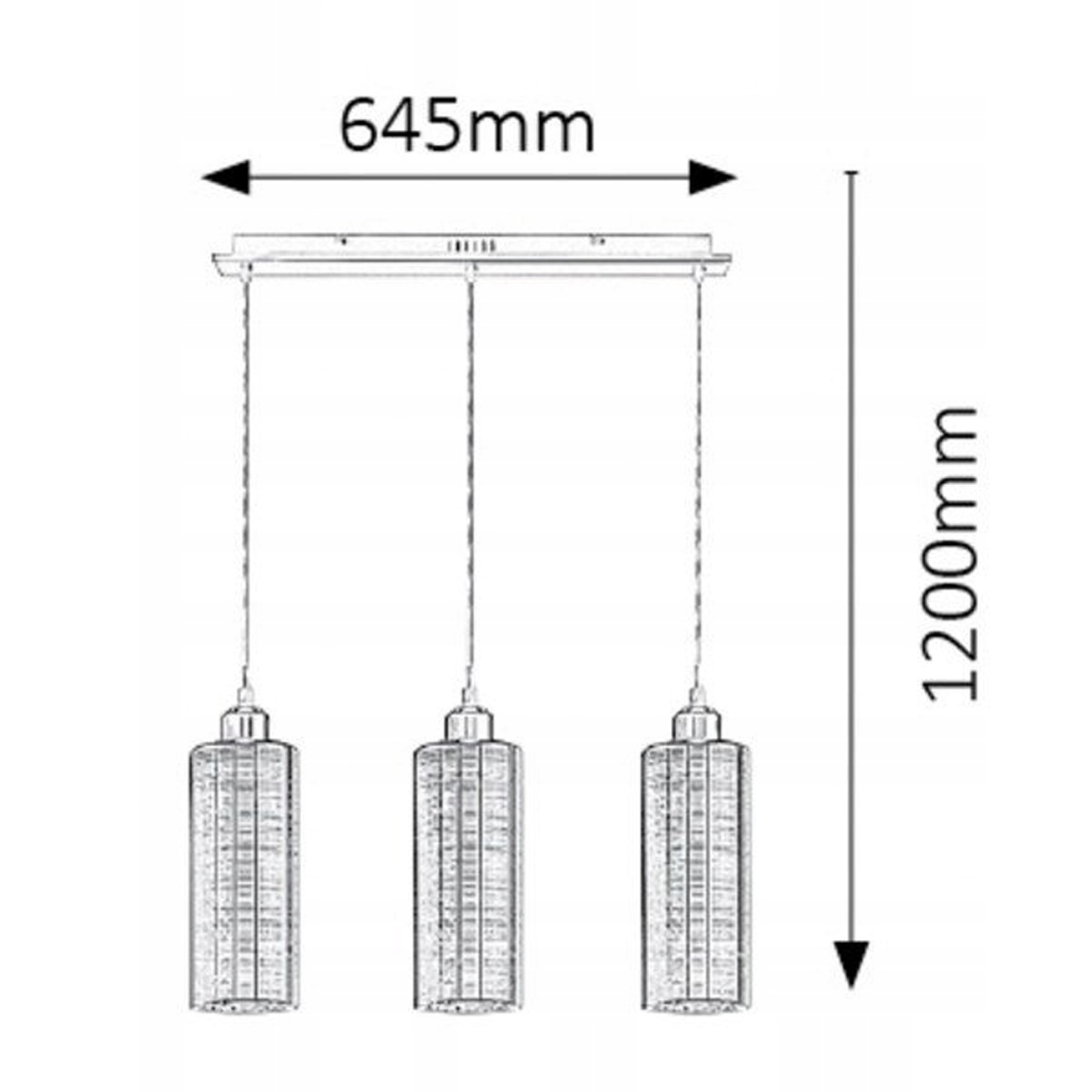 Modern pendant lamp with 3 sockets. Fixed pendant lamp 120 cm long, 64.5 cm wide, metal structure in chrome and glass lampshades with patterns, IP20 protection. The lamp has an E-27 socket and can be used with 3 energy-saving lamps with a maximum power of 40W.