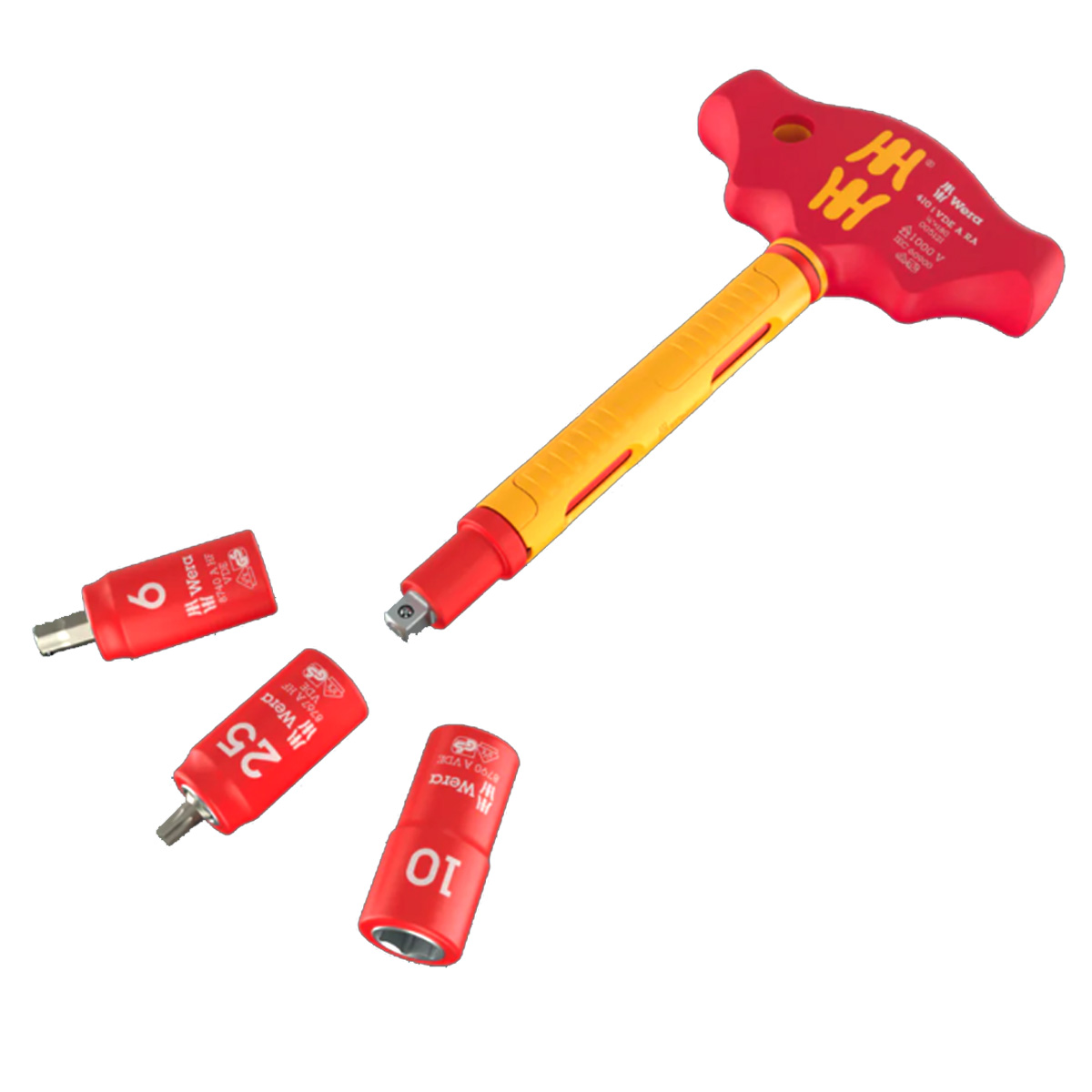 The all-rounder set for VDE applications. Two bitholding screwdrivers 837 i RA and 817 VDE for Kraftform Kompakt VDE blades 837 i RA with ratchet functionality for accelerated screwdriving. 11 Kraftform Kompakt blades for slotted screws, Phillips-head screws Phillips and Pozidriv and TORX® screws. Even low-lying screw and spring elements can be reached thanks to the reduced blade diameter. The Take it easy tool finder colour coding by profile as well as laser-engraved size indication makes it easy to reach for the required blade. One T-handle with ratchet functionality for 1/4 sockets. The recesses in the fast-rotating sleeve on the blade allow resistance to be generated by finger force which allows the ratchet mechanism to be used even at low resistance of the screw. 9 sockets offer increased safety thanks to the 2-component insulation with a yellow insulation core under an outer red insulation layer. The inner yellow insulation layer becomes visible if the outer red VDE insulation layer is damaged. All tools are individually tested at 10,000 Volt as per IEC 60900. Space-saving and safe storage in a textile box. The textile box can be docked directly onto the Wera 2go transport system or attached to the workshop trolley, tool wall, etc with the included hook and loop fastener strip.