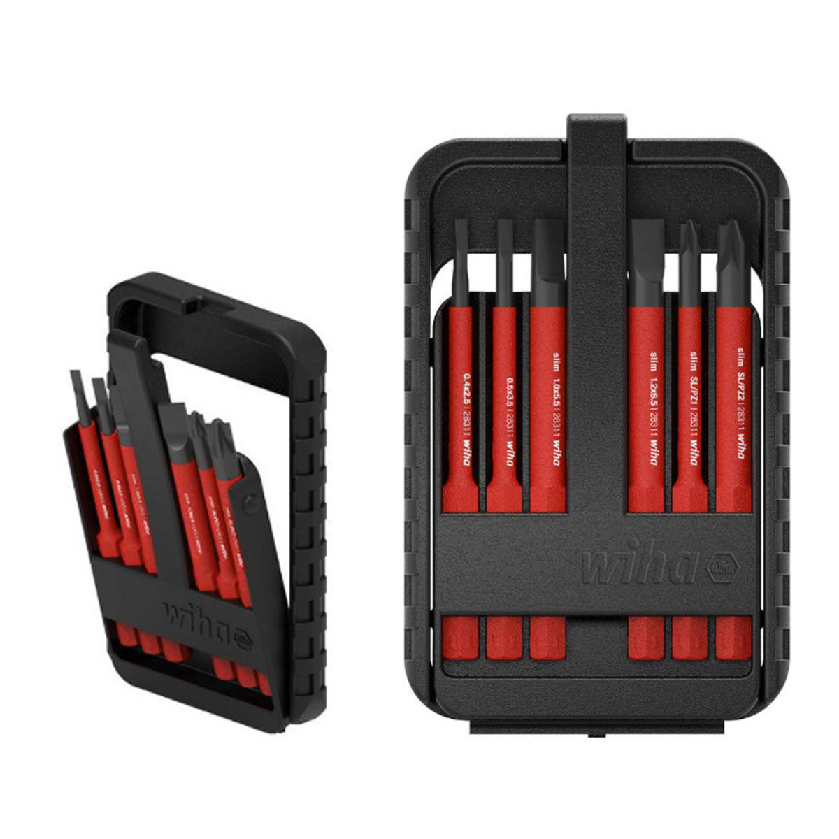 To reach low-lying screws, the blade diameter is often too large in conventional electric screwdrivers. Because removing insulation is not permitted and also compromises the users safety, protective insulation has been integrated into the blade with the Wiha slimTECHNOLOGY. This has been specially developed for electrical applications, thereby ensuring blades up to 33 slimmer. This means low-lying screw and spring elements can also be easily reached with the slimBits. The insulated slimBits undergo individual piece testing as per the international IEC 60900 standard, *providing users with a tool to work safely on live parts up to 1,000 V AC. The slimBits are also stored away in an ingenious bit box, which provides an optimum view of the screw profiles. The 6 mm slimBits can only be used with speedE®, slimVario® or TorqueVario®-S electric tools.Content:1x slimBit electric bit Slotted 2.5 mm x 75 mm 345781x slimBit electric bit Slotted 3.5 mm x 75 mm 411591x slimBit electric bit Slotted 5.5 mm x 75 mm 345811x slimBit electric bit Slotted 6.5 mm x 75 mm 345821x slimBit electric bit Pozidriv PZ1 x 75 mm 345851x slimBit electric bit Pozidriv PZ2 x 75 mm 345861x slimBit boxProduct dimensions187 x 15 x 112 mm LxWxD
